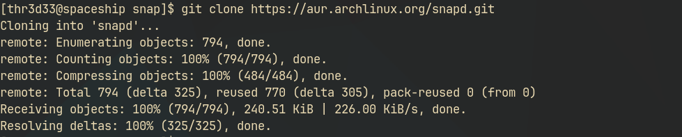 This is a manual install of the AUR package. First we clone the repository then we will cd into the working directory (snapd) and makepkg to build our version of snapd .