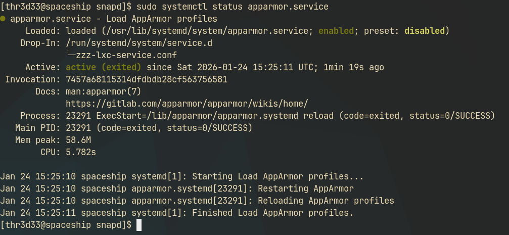 Below we enable apparmor for the snapd daemon.